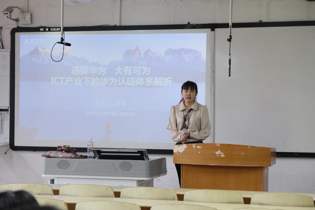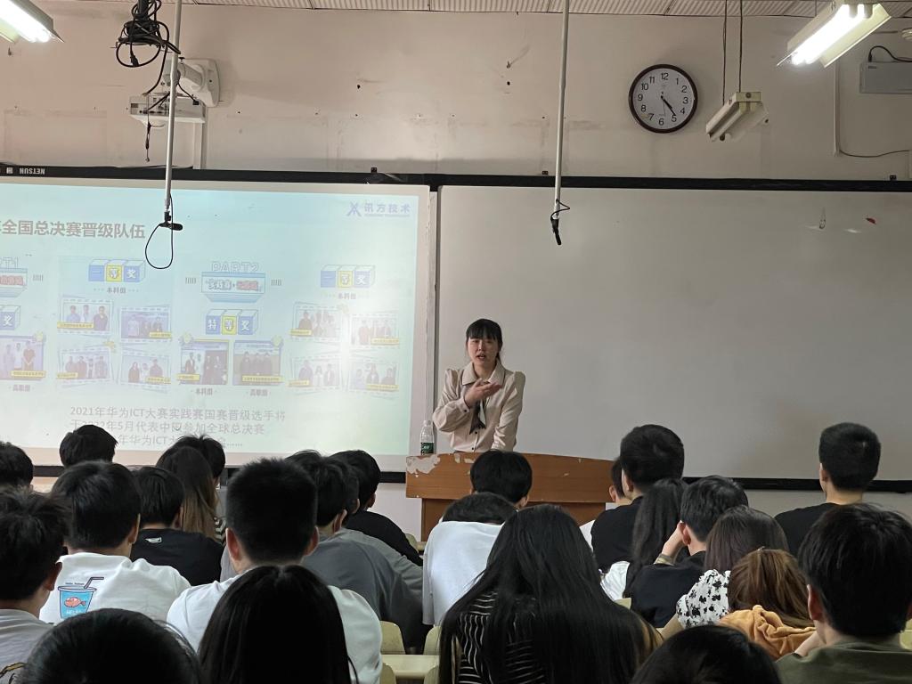 为深化我院学生对ICT产业的了解,鼓励学生积极参加ICT产业相关竞赛,提升专业技能,学院于4月21日在合川校区3303教室开展了两场以“选择华为·大有可为·ICT产业下的华为认证体系解析”专题讲座。主讲人陈雪,为深圳市讯方技术股份有限公司重庆区域校企合作经理、国家二级企业人力资源管理师、高级数据处理师。当天,学院260名学生参与讲座。