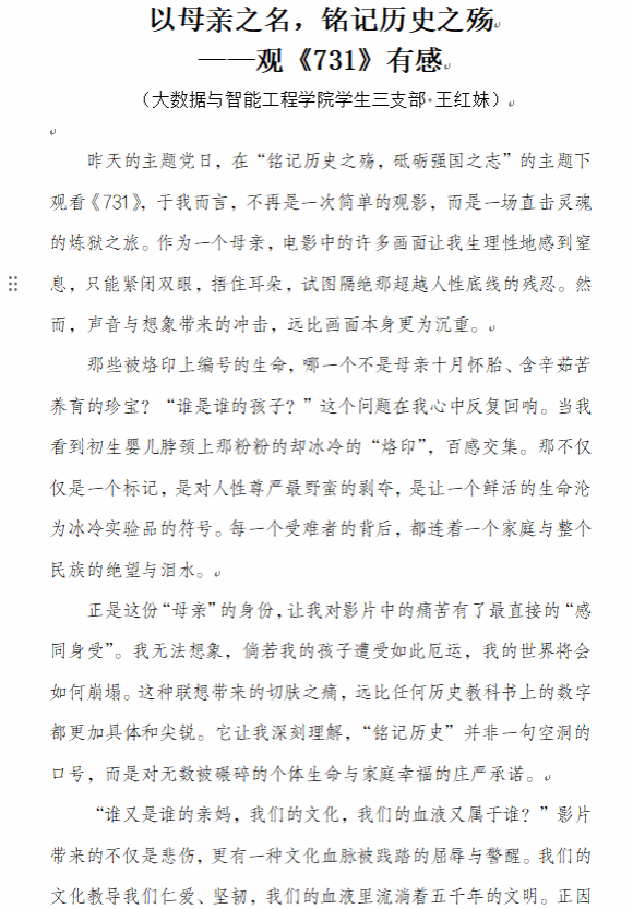 本次活动精选历史题材影片《731》,该片以真实历史事件为背景,还原了抗日战争时期日本731部队实施细菌战、人体实验等反人类罪行的黑暗历史。影片深刻揭露了侵略战争的残酷本质,生动展现了中国人民在党的领导下不屈不挠的抗争精神,全体观影党员深受震撼。