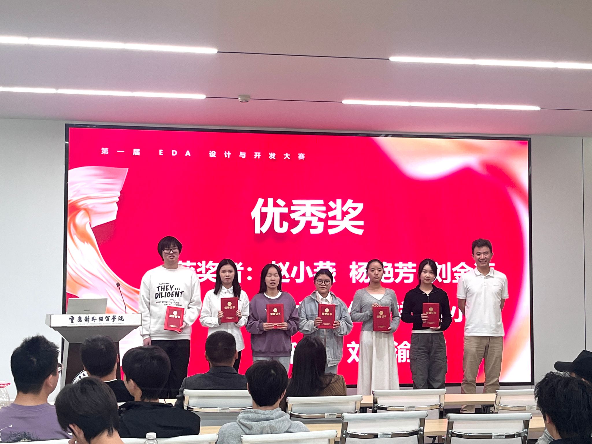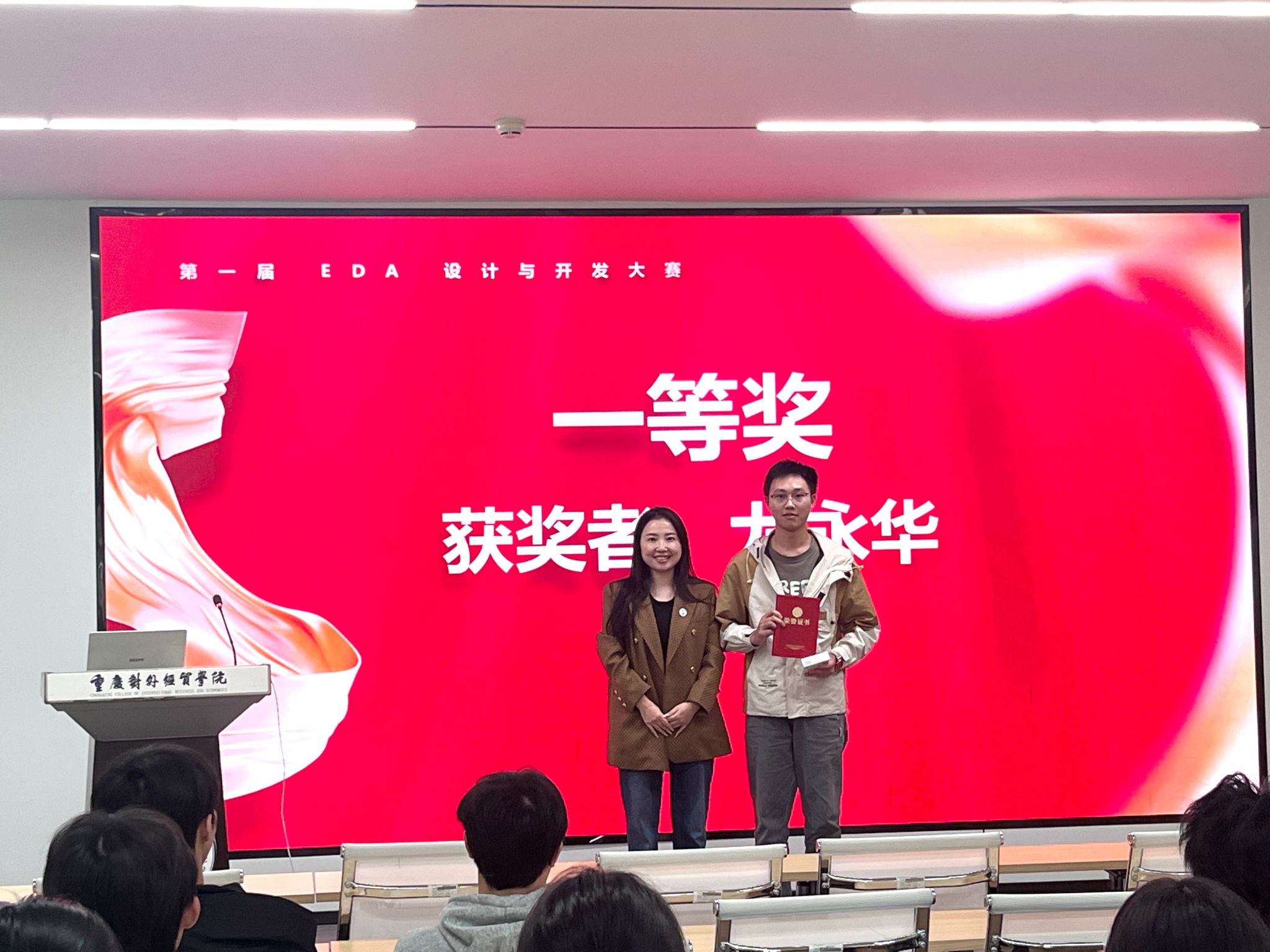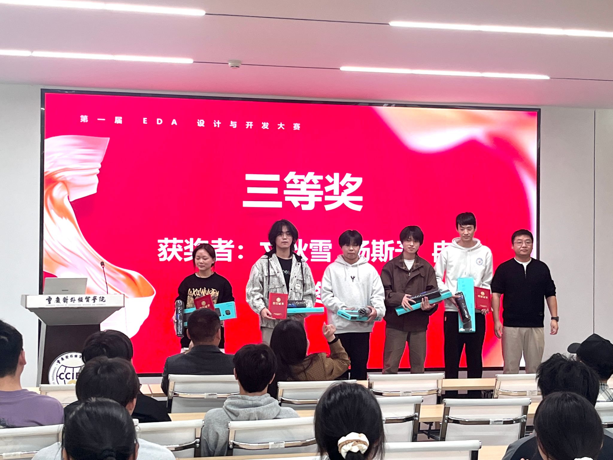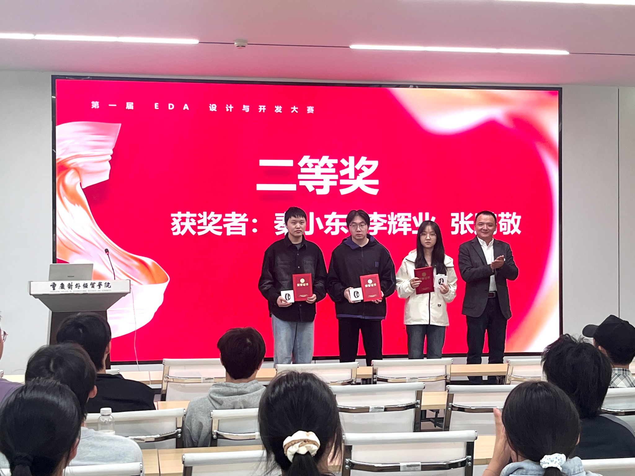 经评委团队多轮评审、严格打分,17名选手凭借扎实的专业功底与出色的实操能力脱颖而出:尤永华获一等奖,秦小东、李辉业、张鹏敬获二等奖,文秋雪、杨斯予、冉辰、汪叮咚、刘体锐获三等奖,赵小燕、杨艳芳、刘金源、黄依萍、代锡祥、邓小凤、杜秋菊、刘江渝获优秀奖。10月23日,第一届EDA设计与开发大赛颁奖典礼在A9418举行。学院胡蓉书记、唐士副院长、电子科学与技术系周杰主任及专业教师代表出席,与参赛选手们共同见证荣誉时刻。