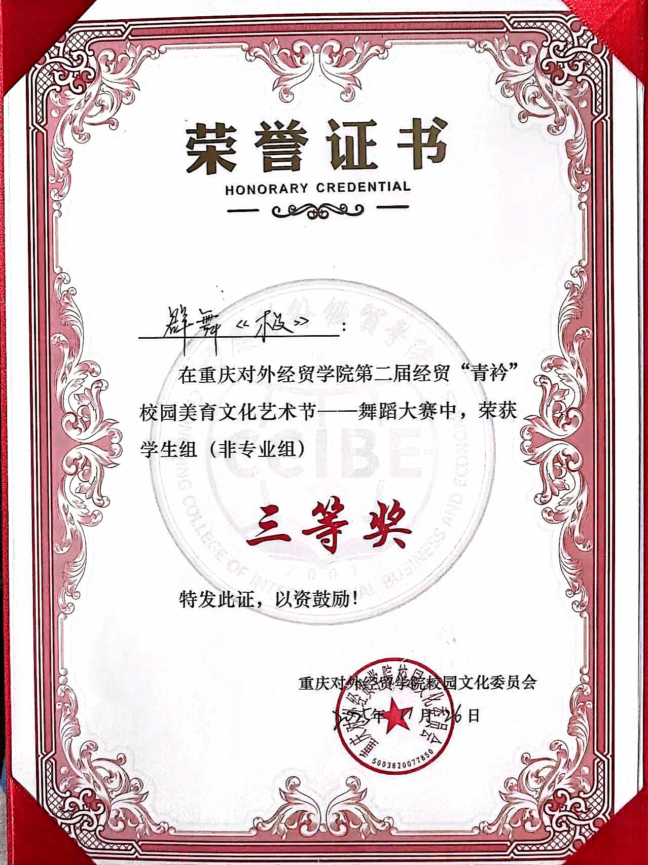 为全面加强和改进新时代学校美育工作,深入推进校园美育建设,丰富学生课余生活,近日学校举办了第二届经贸“青衿”校园美育文化艺术节——舞蹈大赛。学院学子朱柄锦、刘瀚中、彭欣平、李原影以及文创学院刘芳廷共同组成的团队在决赛中荣获三等奖。